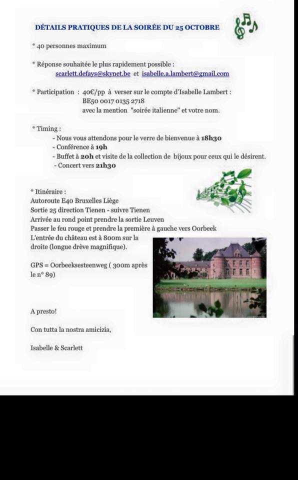 By soumayahallakoctobre 16, 2015Blog Soirée italienne et concert au château d’Orbeek en Belgique le 25 octobre 2015 à 19h avec Han Bin Yoon, violoncelliste Partager : Cliquez pour partager sur Facebook(ouvre dans une nouvelle fenêtre) Facebook Cliquez pour envoyer par e-mail à un ami(ouvre dans une nouvelle fenêtre) E-mail J'aime chargement… Articles similaires
